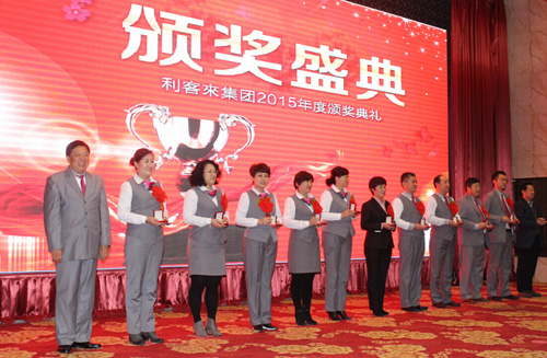 总结报告会结束后,大气磅礴的“适应新常态、引领新常态”——利客來集团2015年度回顾片拉开了年度颁奖盛典的序幕。影片仔细回顾了2015年集团走过的风雨历程,从集团的数字指标、社会美誉度的提升、荣获中国驰名商标,到创新经营模式、优化管理结构;从新颖的促销活动、到专业公司的蓬勃发展;从企业逆势扩张不断壮大,到关爱职工、人文关怀,一幕幕画面让每一名利客來人感到骄傲自豪、心潮澎湃。回顾片结束后,重头戏颁奖环节拉开了序幕。双十佳先进集体、十佳优胜单位、十佳促销员、十佳好青年、双十佳技术能手、十佳优秀党员、劳动模范、双十佳金牌经理、十佳优秀管理者依次上台领奖,成为了当天最闪耀的明星,领导们分别为获奖者颁发了金牌。